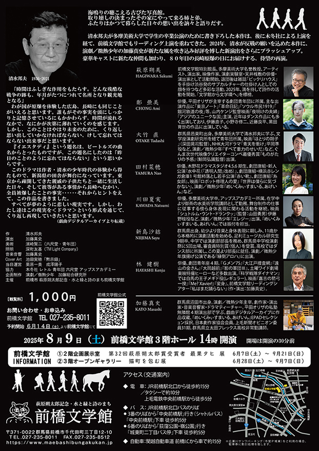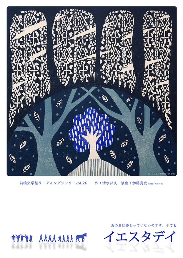 前橋文学館の夏の恒例イベントとなった清水邦夫『イエスタデイ』のリーディング公演。大好評だった昨年の上演が入場をお断りするケースも出たほどの盛況だったこともあり、80回目の長崎原爆の日にメモリアルな再演となった。フライヤーデザインは2024年からイメージを一新し、2024年度版上演を観劇した画家・池田実穂氏による提案で氏の木版画「黙示録」をイメージアートに採用した。