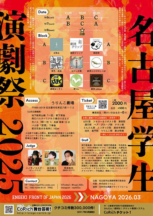 名古屋(東海圏)でいちばんおもしろい学生劇団を決めるお祭り。今年度はコロナ禍後最多出場団体数である。また、つぎの全国学生演劇祭の開催地が名古屋であるため、推薦団体数が通常より1団体多い、2団体となる。このコンペティションのアツさと、夏に行われるというアツさを表現している。