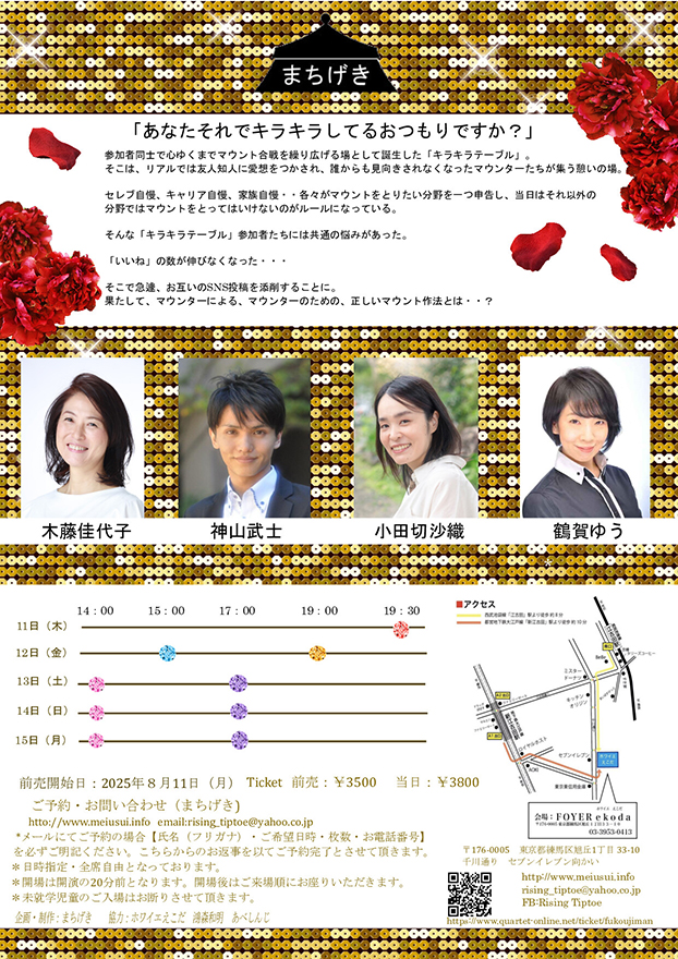 チラシデザインは、「不幸自慢」というワードから連想するイメージとは真逆なキラキラ感をあえて前面に出すことで、マウンターの深層心理(実はキラキラな生活を送っているわけではなく、承認欲求が強くてむしろ不幸)を表現してみました。シンプルながらインパクトがあり、かつ意表をつくデザインを心がけてみました。