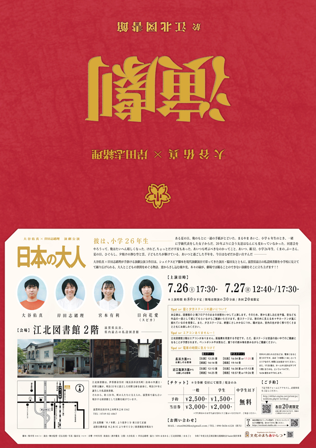 今公演は、柴幸男の「日本の大人」を、滋賀県最古の図書館『江北図書館』にて、そのレトロモダンな内装をそのまま活かす、借景を軸とした演出プランによって上演するものでした。